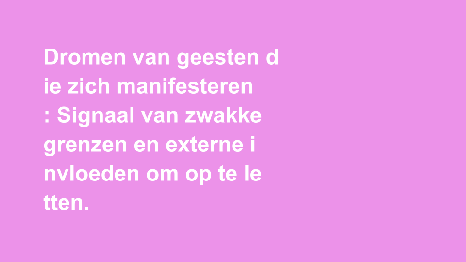 Dromen waarin je het gevoel hebt bezeten te worden door geesten kunnen een reflectie zijn van je eigen innerlijke strijd. Ze kunnen duiden op gevoelens van machteloosheid of angst voor ongecontroleerde externe invloeden. Psychologisch gezien kan deze droom voortkomen uit een gevoel van kwetsbaarheid in je dagelijks leven. Misschien ervaar je stress op het werk, problemen in je relaties of andere situaties waarin je je overweldigd voelt. Het is belangrijk om te kijken naar wat deze dromen voor jou persoonlijk betekenen, en te onderzoeken welke angsten of zorgen je misschien onderbewust voelt.